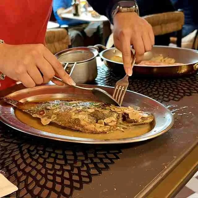 - Lenguado con su refrito y patatas panaderas: Esta fue mi elección personal. El pescado estaba francamente rico y clavado de punto. Tienen el detalle de limpiarlo en la mesa frente al comensal; en nuestro caso, nos tocó una camarera un poco inexperta a la que le costó un pelín la maniobra, pero lo suplió con creces siendo tremendamente voluntariosa. El plato quedó de diez.
